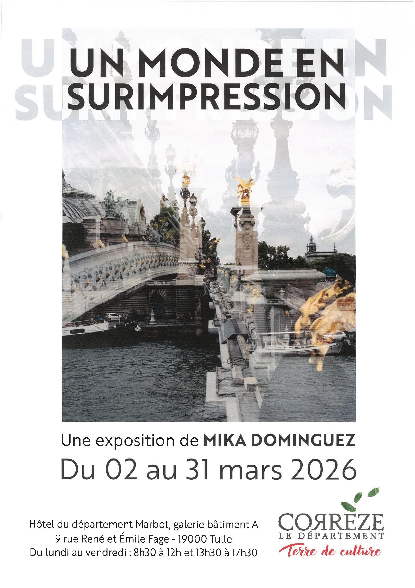Exposition de Mika Dominguez " Un monde en surimpression" Ouvert du Lundi au vendredi de 08h30 à 12 h et de 13 h 30 à 17 h30