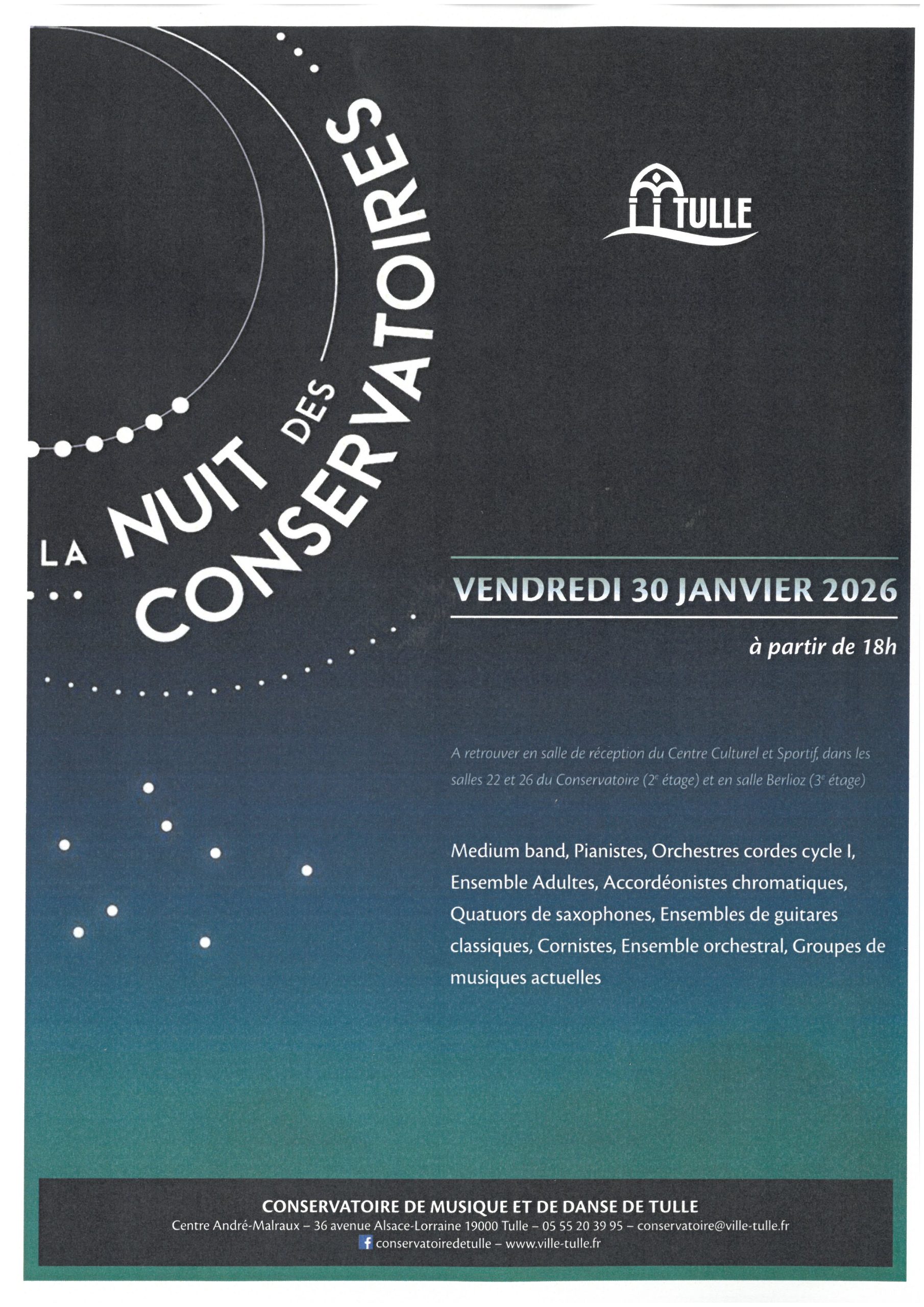Cette année, le Conservatoire de Tulle participe à la 13e édition de la Nuit des Conservatoires. Ce rendez-vous national a pour but de faire découvrir, dans une ambiance conviviale, la diversité des pratiques artistiques enseignées dans les équipements culturels.