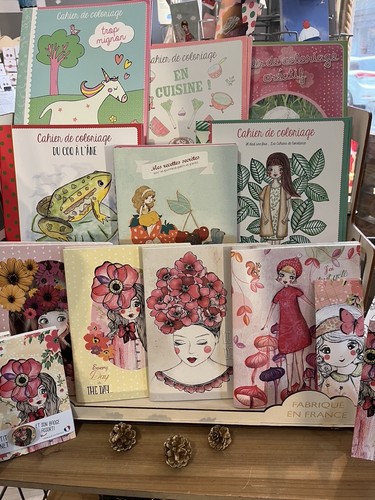 - de la papeterie ludique : petits carnets, cahiers à thème, coffrets d’écriture, cahiers de coloriage, coloriages géants...